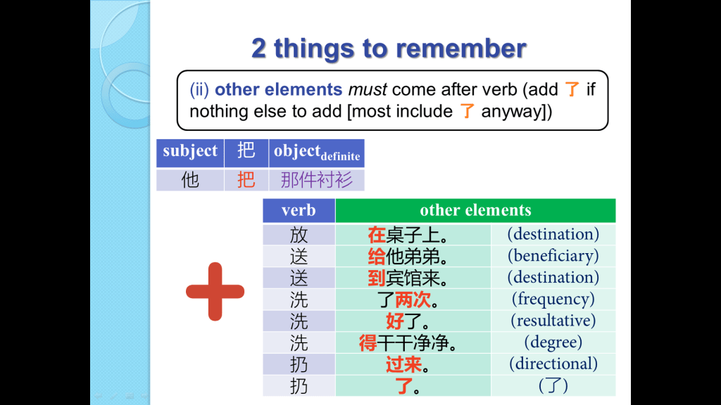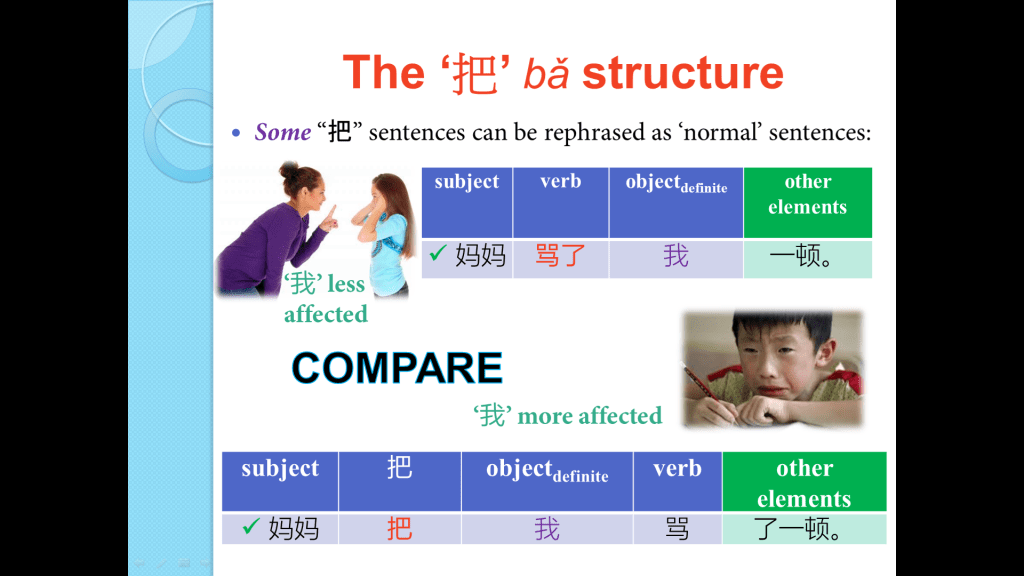Before we get into discussing WHY one would want to use the 把-structure ever, let’s start off with the basic word order facts and how to form the structure. A 把-structure is formed essentially by doing 2 things: